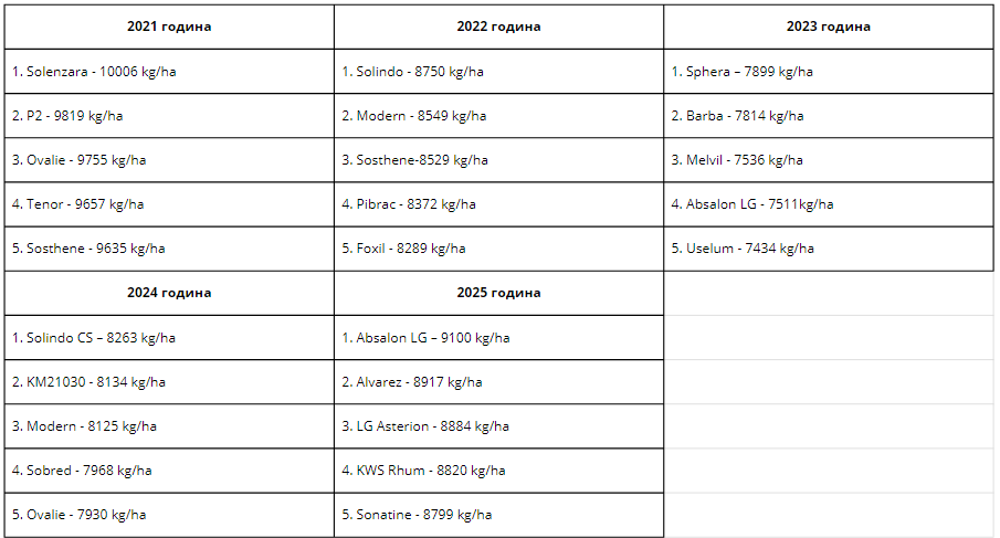 Tabela 1. Prinosi prvih pet sorata po rangu u makroogledu ozime pšenice IRI “TAMIŠ” DOO, Pančevo 2021-2025.